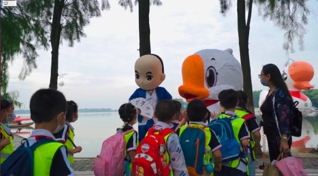 “兰小白”源于央视热播动画片《少年师爷》主角小师爷的宠物鹅,是浙江特立宙动画影视有限公司历经10多年精心打造的卡通角色,其经典形象受到观众喜爱。“兰小白”从兰亭“小白鹅”变身而来,已成为绍兴文旅经典IP。此次“兰小白”游东湖显得格外精神,黄色鹅冠,两侧翅膀分别用绍剧和京剧脸谱点缀刻画,象征着它来自戏曲之乡绍兴。它的胸前还印有“东亚文化之都”绍兴印记,寓示着“兰小白”已成为传播“东亚文化之都”绍兴的“文化使者”。